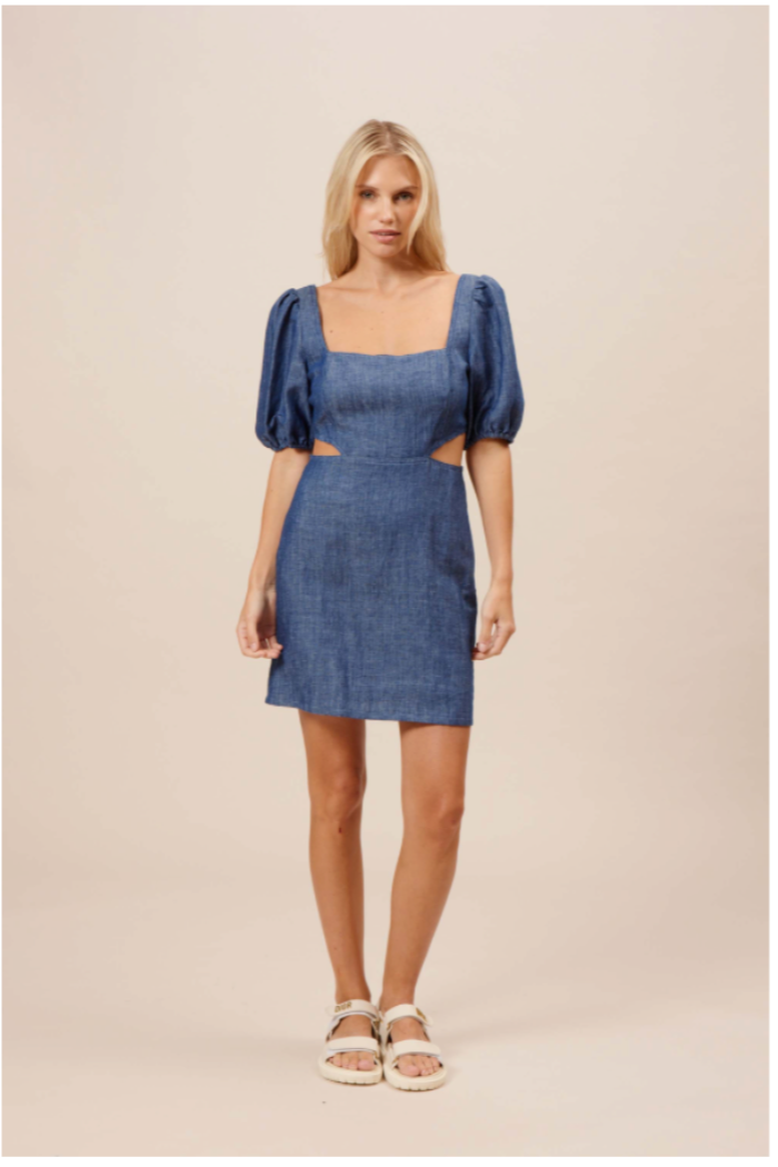 Denim Back zipper Mini length Side cut outs Square neckline Model wears a size small This style fits true to size! GARMENT CARE Each item we make is produced and handled with care. We encourage you to consider the environment when cleaning our items.