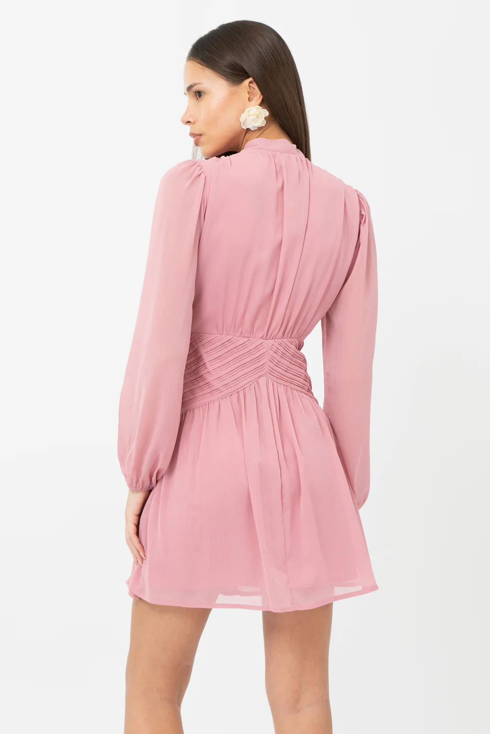 Designed with beautiful draping and folds, "The Betsy Dress" shows off a tie neck detail that can be played with or left untied. The skirt features asymmetrical folds along the waist for a flattering fit and flare silhouette. The piece also features balloon sleeves and a V-neckline.