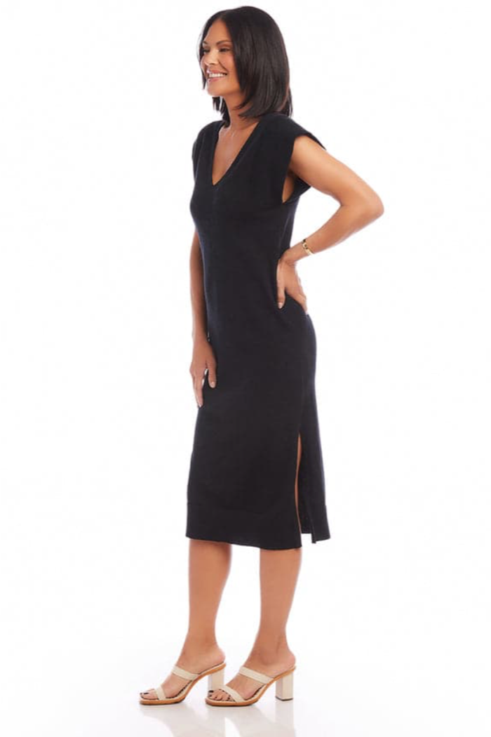 Experience the perfect blend of style, comfort, and sustainability with this sleeveless sweater dress. Crafted with a 1x1 rib blend of eco-conscious recycled polyester and nylon, this dress features a sleeveless design, offering a modern twist on the classic sweater dress silhouette.