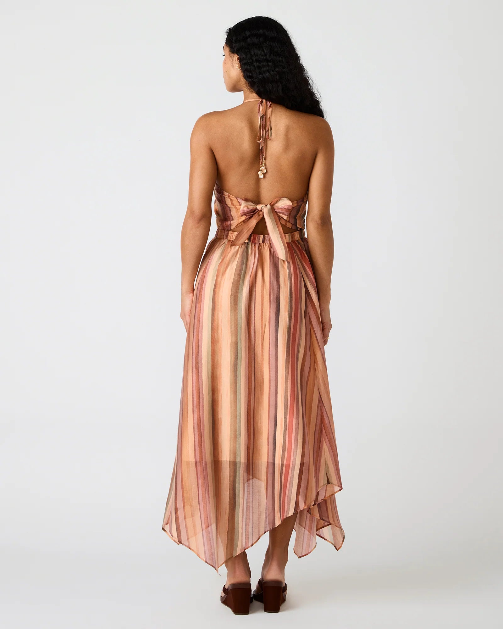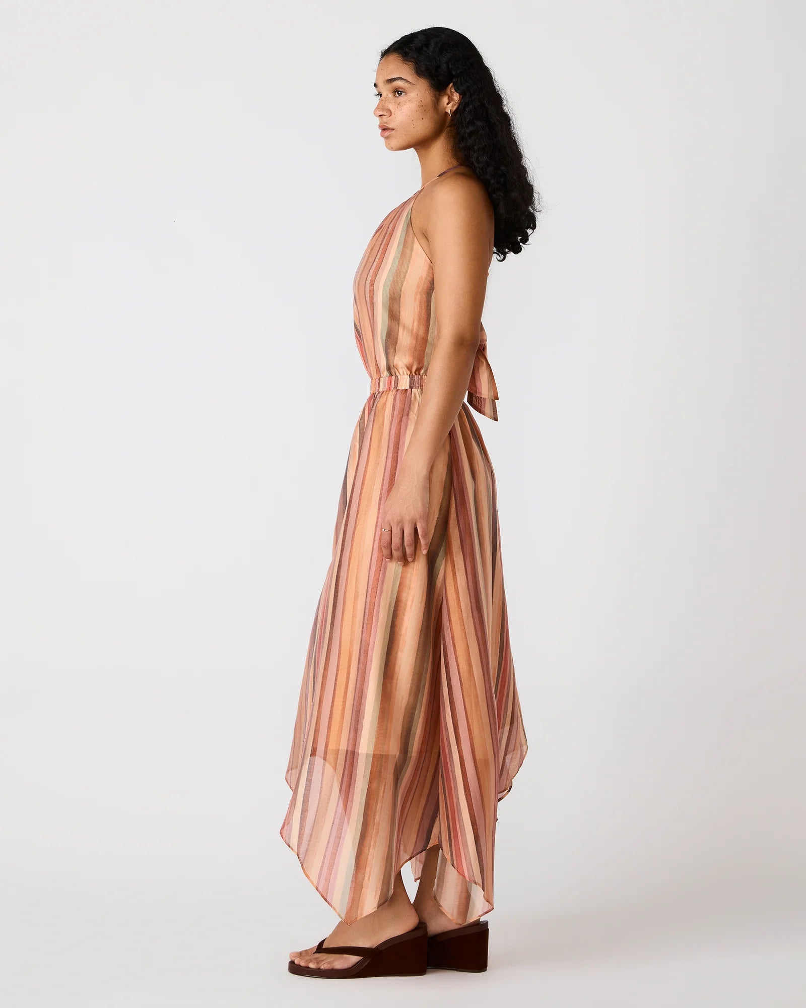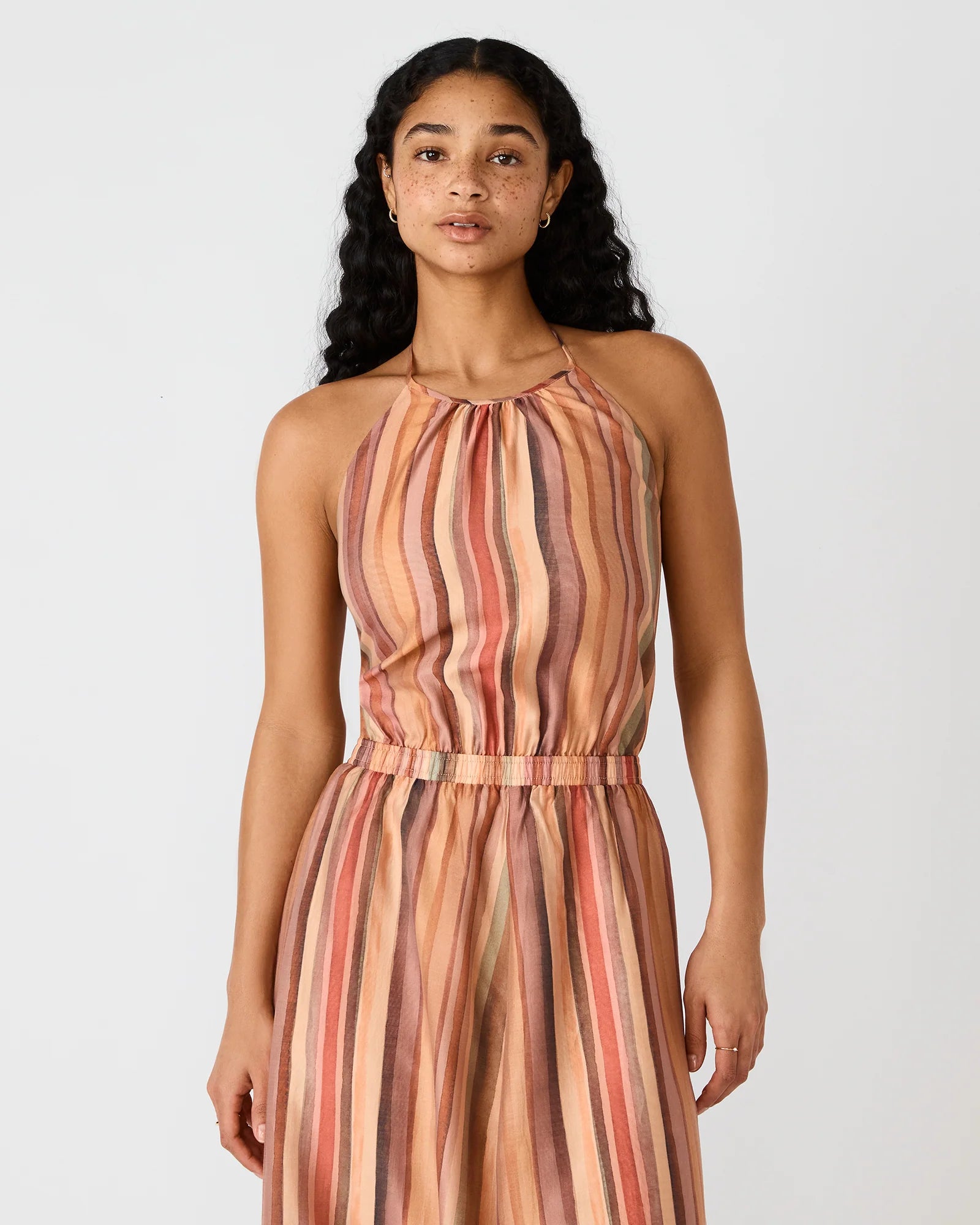 The Dalina Dress features a graceful halter neckline that elegantly frames the shoulders while offering versatile styling options. Vertical stripe detailing in a multi-color palette adds visual interest and movement to the silhouette. The flowing fabric drapes beautifully, creating a relaxed yet refined aesthetic perfect for warm-weather occasions. This piece transitions effortlessly from casual daytime wear to evening events, making it a versatile addition to any wardrobe.