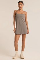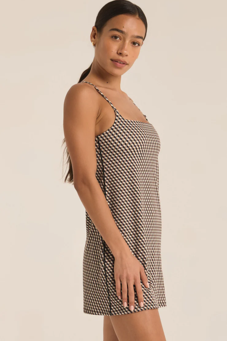 Loungewear meets activewear with the Z Supply Doubles Geo Sandstone Active Dress. This versatile and stylish dress features a geometric print and soft, comfortable fabric for all-day wear. Take your comfort to the next level while still looking effortlessly chic. Perfect for any active or casual occasion. This active dress features a square neck, a geometric design, lined with an inner biker short onesie featuring usable pockets, and adjustable spaghetti straps.