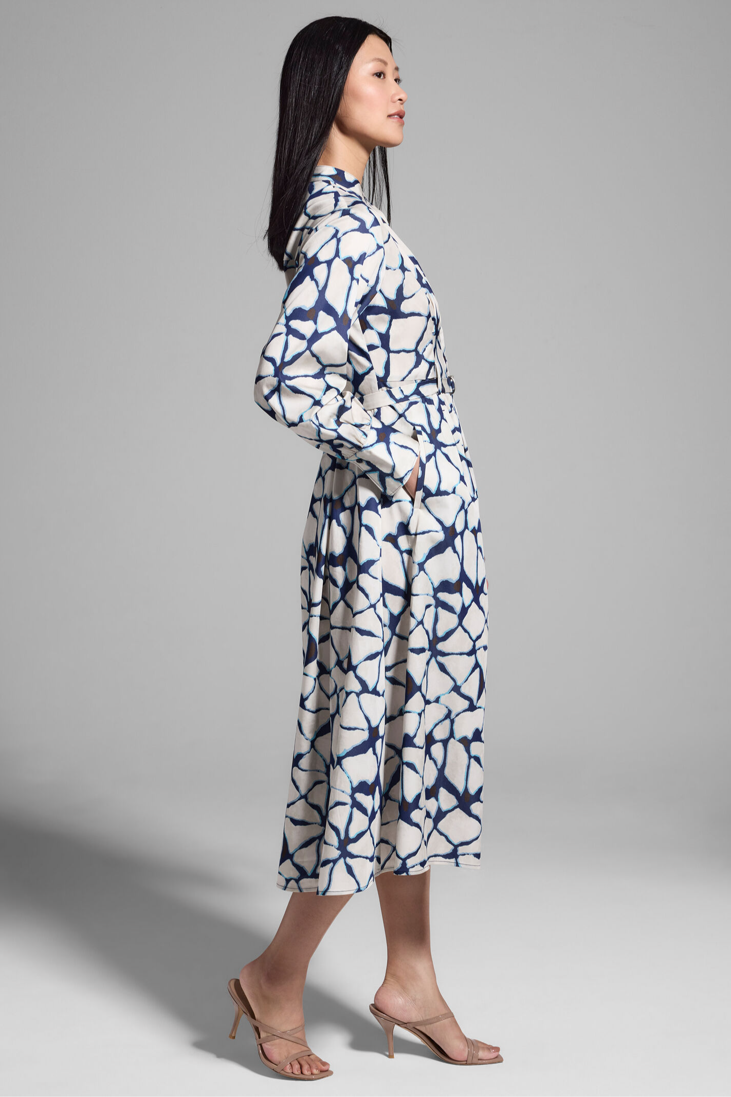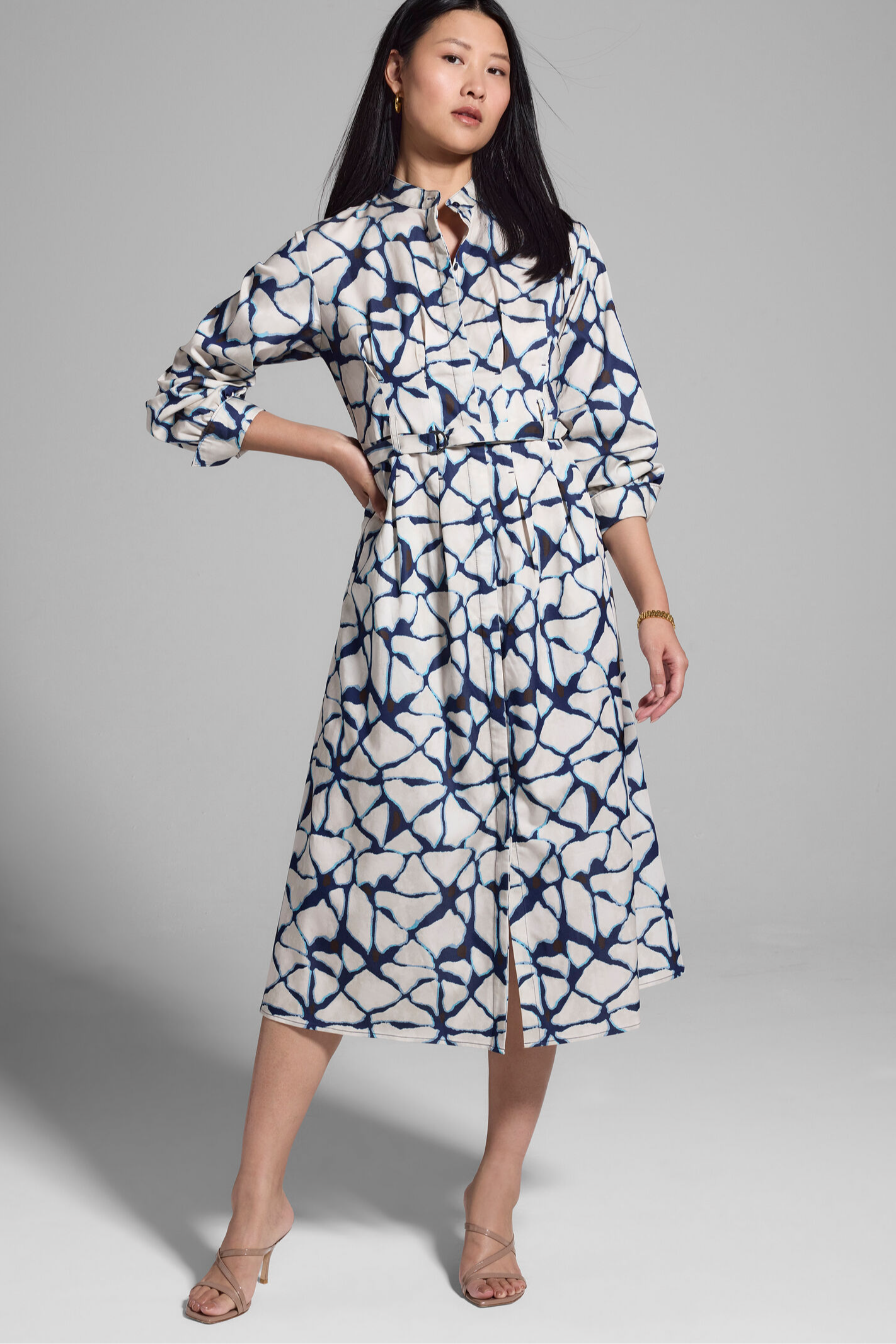 Crafted from fabric that feels like a dream -- soft as cotton, smooth as silk -- this dress boasts a buttery feel but is designed with just the right amount of give for all-day comfort. The subtle print blends sophistication with a playful twist, while the stand collar and button-front design exude timeless refinement and give you plenty of customization options. A self-belt and center back elastic creates an easy, effortless feel. Wide cuffs add a stylish touch, whether you prefer your sleeves rolled or unbuttoned. Perfect for any occasion or just because. With front welt pockets for all your extras.