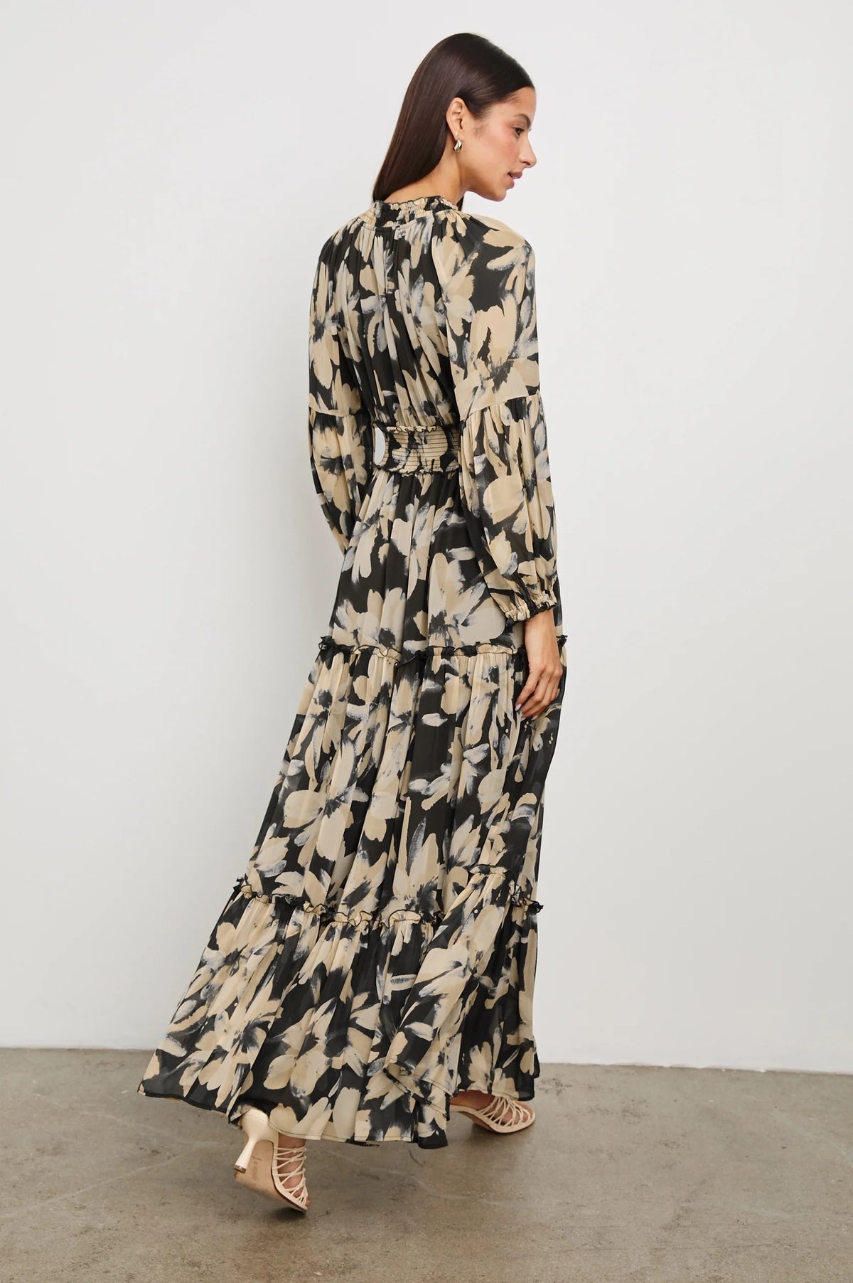 Introducing the Rails Frederica Dress in Charcoal Lily. This sophisticated maxi is crafted from lightweight chiffon that drapes gracefully. Channeling 70s trends, it boasts a smocked neckline and waist, along with ruffled tiers and peplum sleeves, complete with elasticated cuffs.