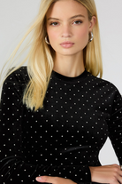 The HAILEE STUDDED VELVET DRESS BLACK is a sophisticated midi-length piece crafted from quality fabric, featuring long sleeves and a refined mock neck. Its design balances elegance with modern edge, making it ideal for stylish evening events or upscale gatherings. The breathable material ensures comfort while maintaining a sleek silhouette, offering a confident and polished look.