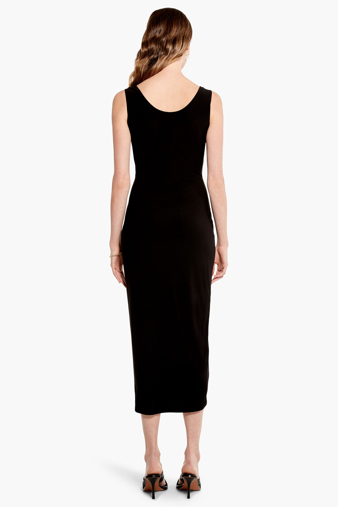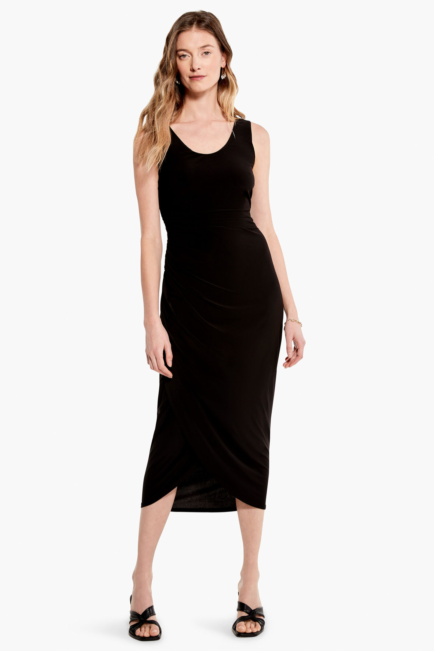 A dressier look that's as comfortable as anything in your closet thanks to the perfect amount of added stretch. This texture wrap effect, and high twist breaks up the monotone and sets this black dress apart from the crowd. Made with a sleeveless pullover silhouette that falls below the knee