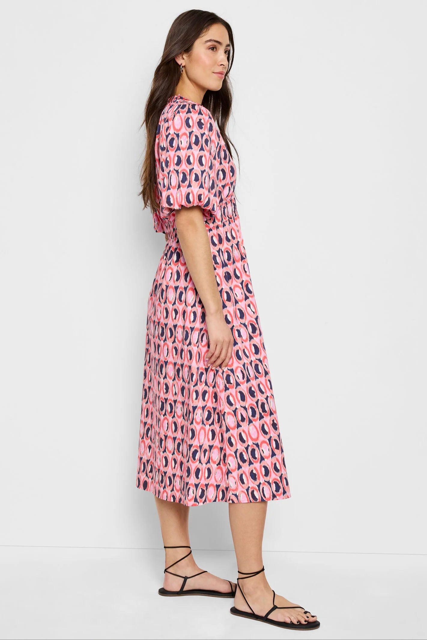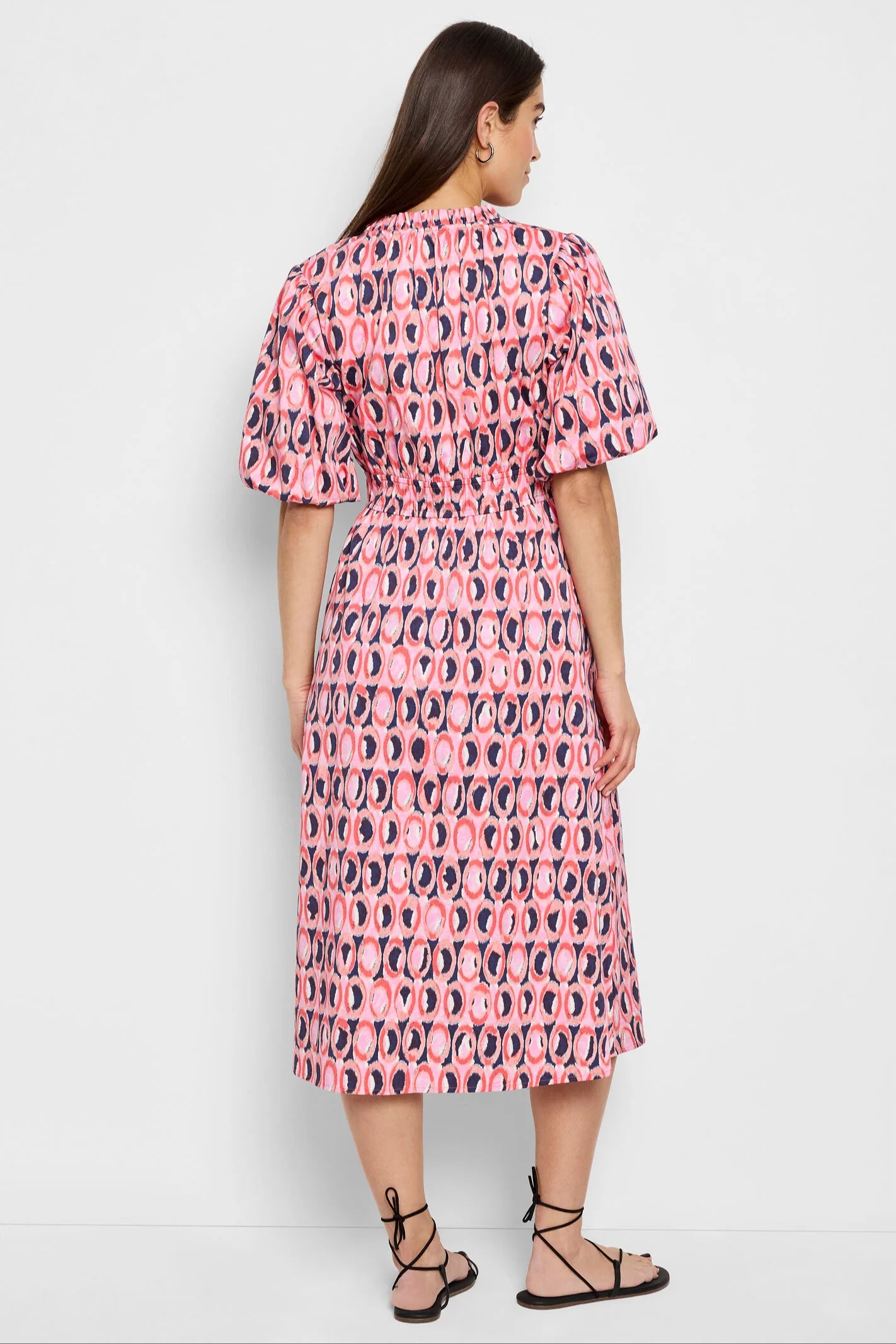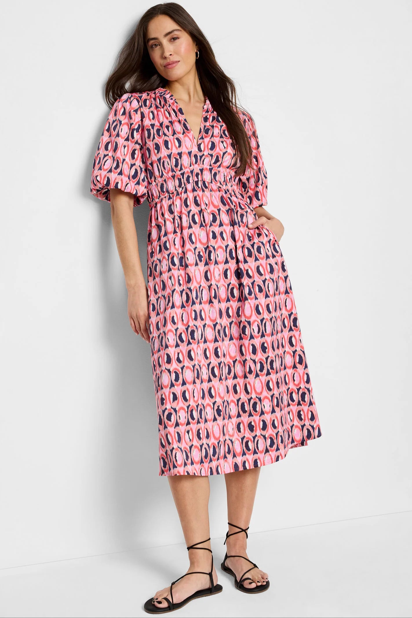 Crafted from 98% cotton with just a hint of stretch, Ikat Rings adds breathable comfort and a flattering fit to your dress rotation. The geometric yet softly shaped pattern adds a playful touch, while the dark indigo tones bring a sophisticated edge. A delicate ruffle around the neckline enhances its feminine appeal, and the elastic waist, designed to point upward, creates a beautifully detailed silhouette. Subtle balloon sleeves complete the look, making this dress fun and flattering without being overpowering.