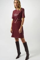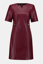 Incorporate contemporary charm into your wardrobe with this leatherette dress. The A-line cut creates a flattering silhouette as the design falls gracefully at the knee. A chic slit neckline with a delicate band detail and front princess cuts add character to the classic look. The short bell sleeves and decorative buttons at the waist complete the piece’s refined allure.