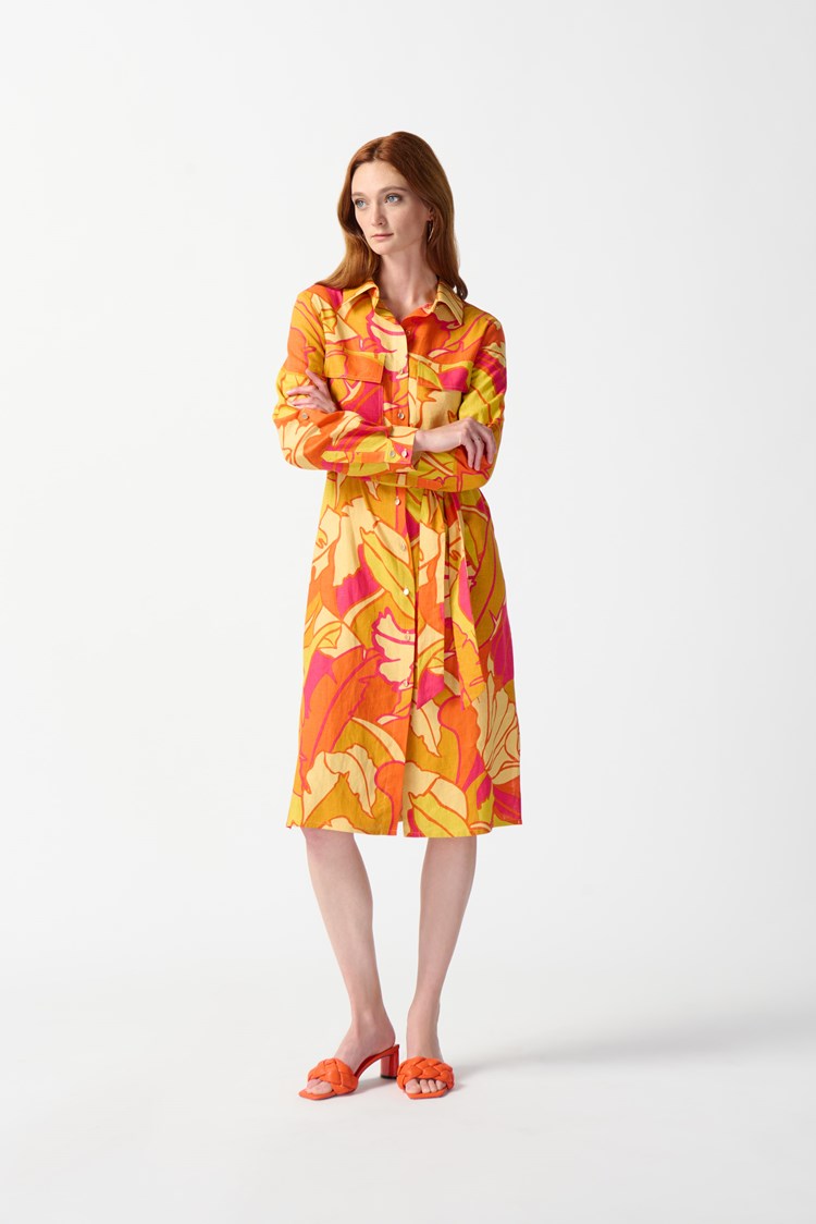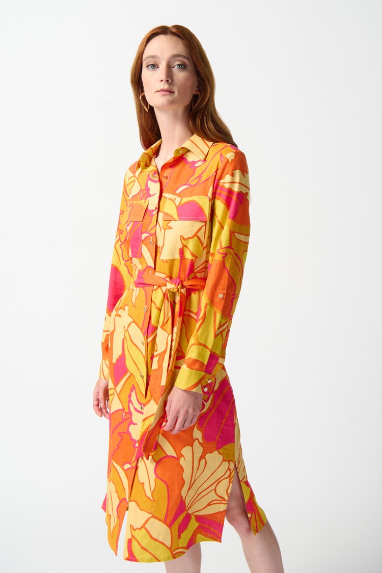 Wrap yourself in the luxurious feel of this charming floral print dress. The classic shirt collar and cuffed long sleeves add a refined elegance to this contemporary piece. With a graceful shift silhouette that falls below the knee, a sash at the waist and functional pockets, this dress is a captivating canvas of beauty and poise.