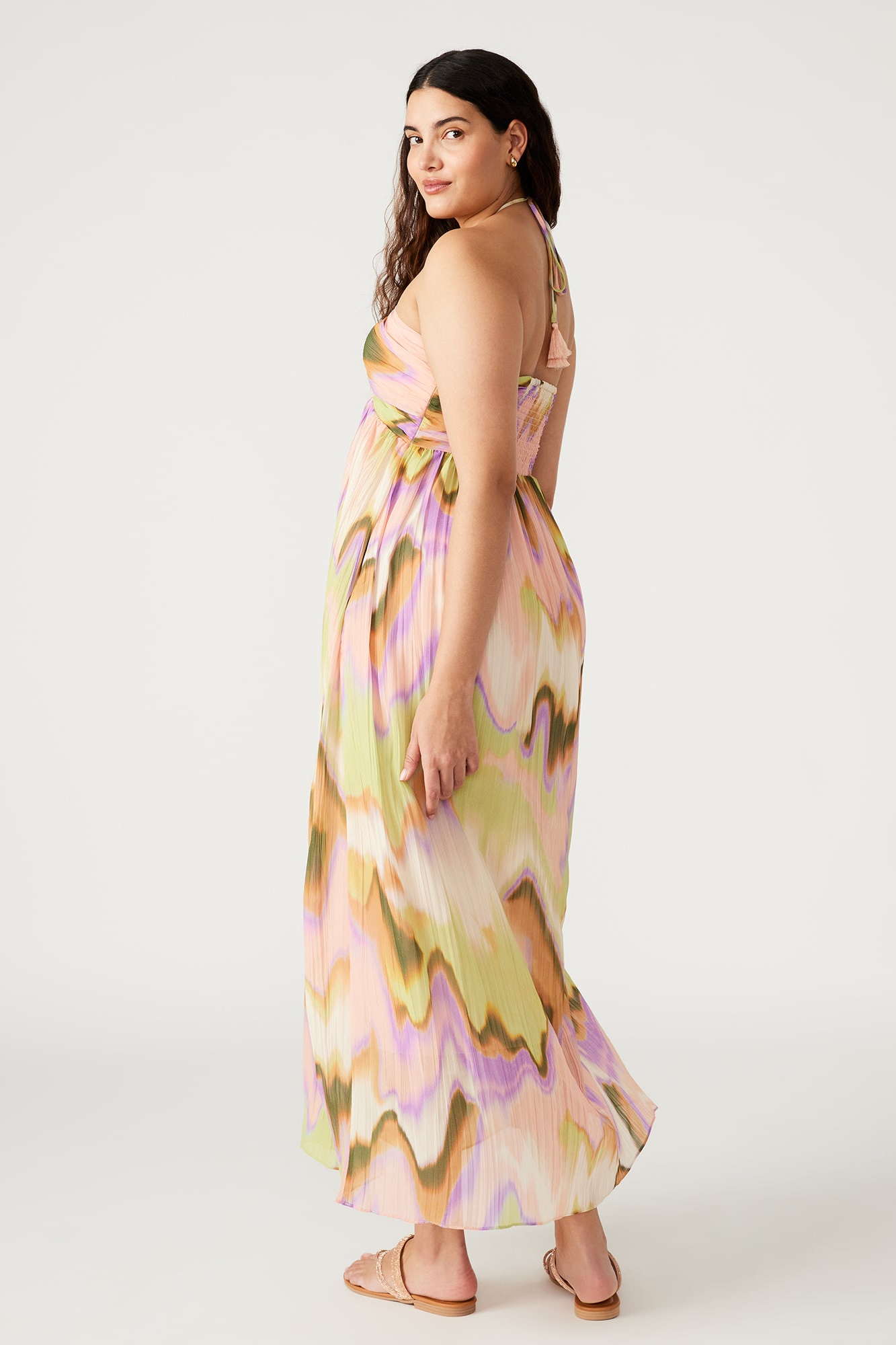 Make a statement with the NOLITA dress. This watercolor tie-dye halter maxi dress features pleated details and is perfect for a stylish yet comfortable summer look. Effortlessly elevate your wardrobe with this versatile sundress.