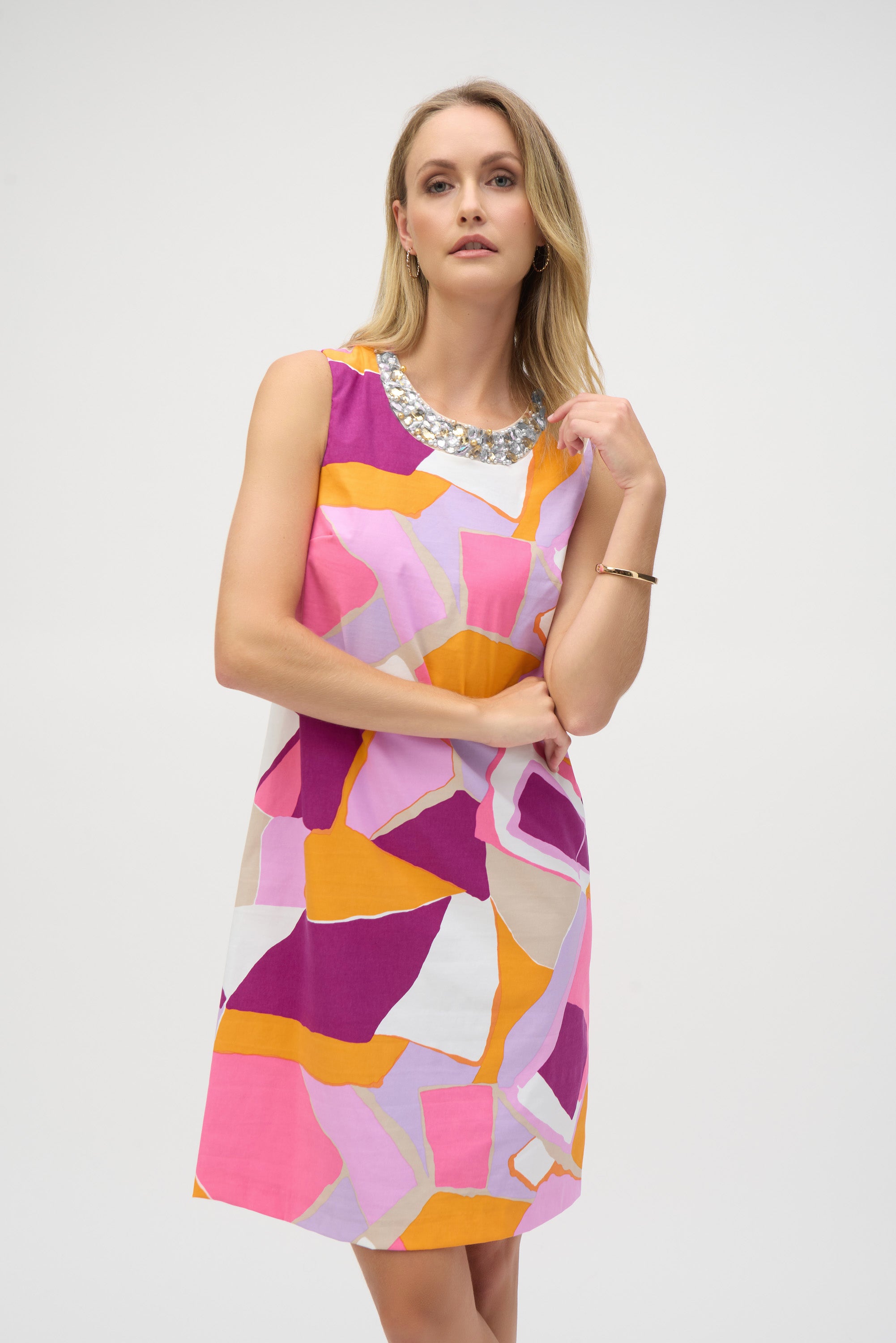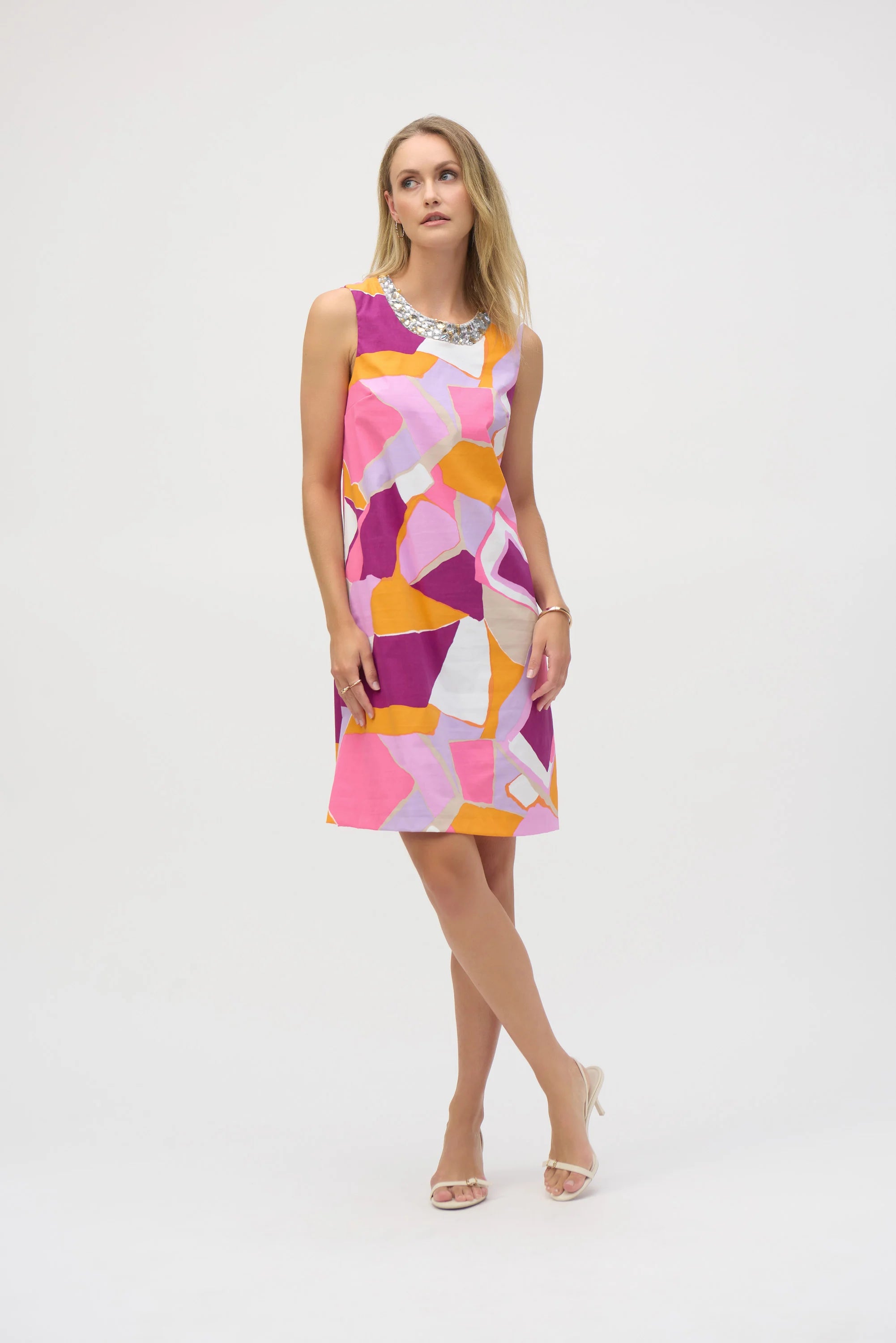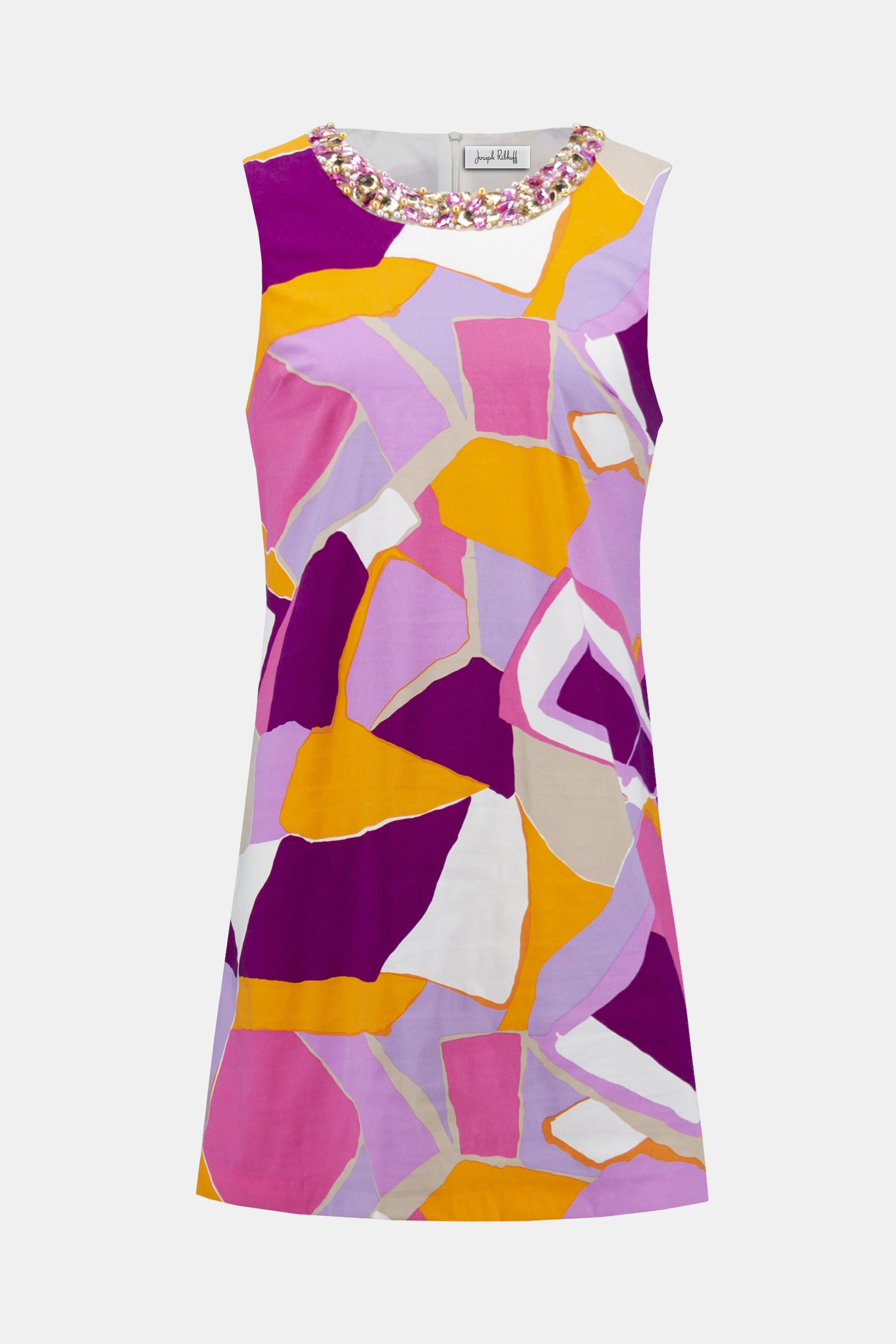 This stretch poplin dress was crafted with a distinctive style as it boasts a striking abstract print. The garment features a sleeveless trapeze silhouette that gives it a classic yet bold appeal. The scoop neckline with beaded appliqué elevates the piece’s sophisticated feel, making this design truly irresistible.