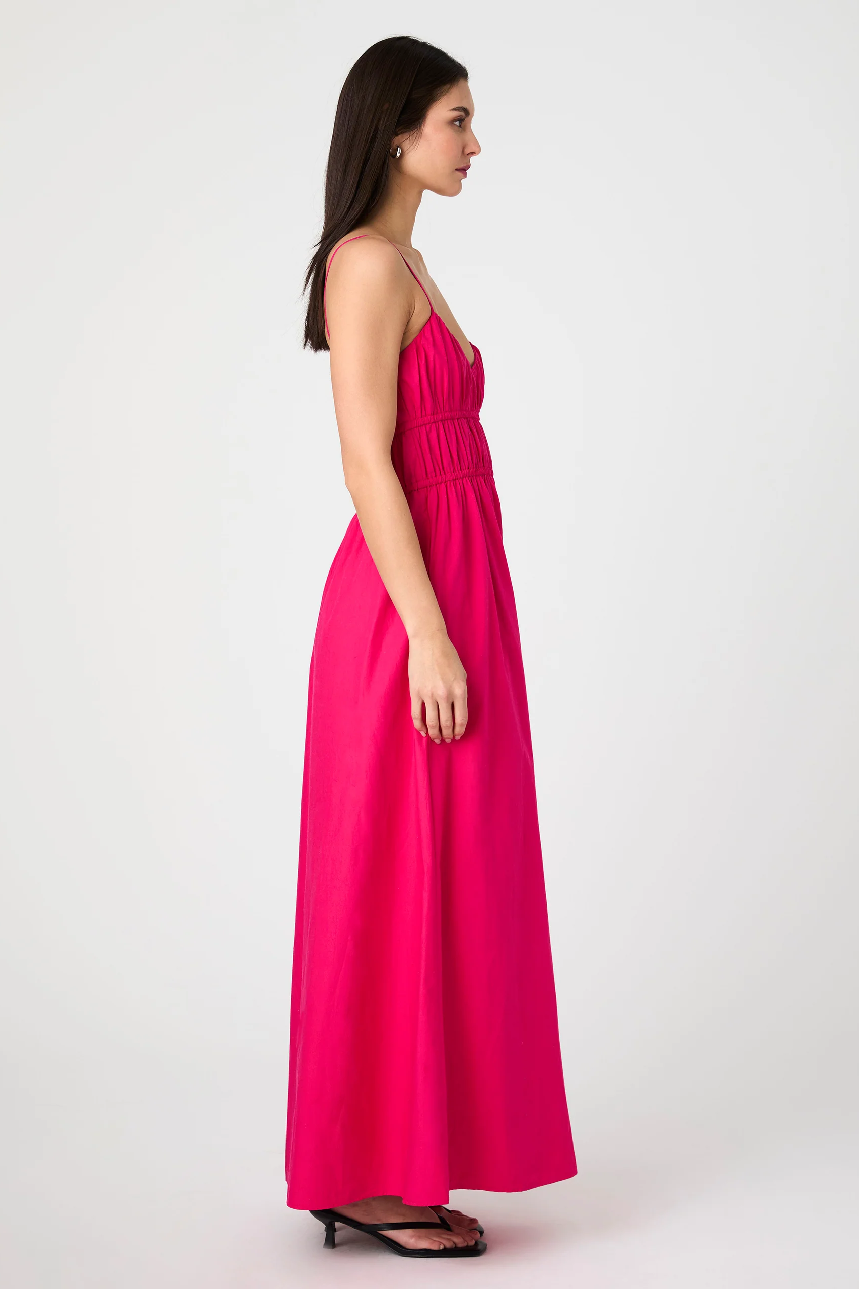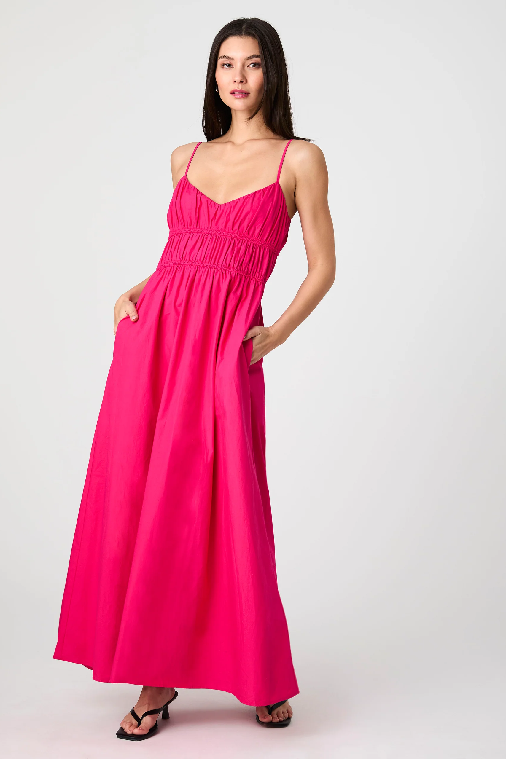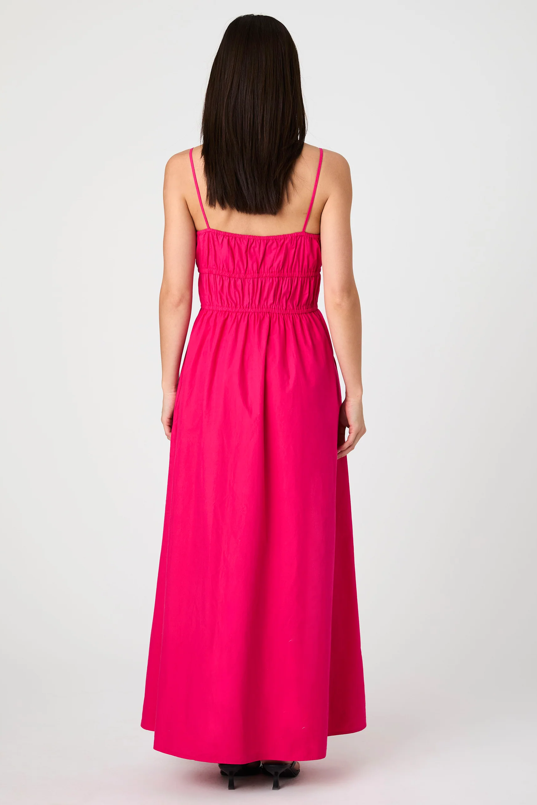 The Poplin Ruched Maxi Dress is equal parts effortless and extra. Made from crisp cotton poplin in a bold cerise pink, it features a flattering ruched bodice, v-neckline, and delicate thin straps. The full-length skirt keeps it breezy, while the pockets make it practical—what more could you want?
