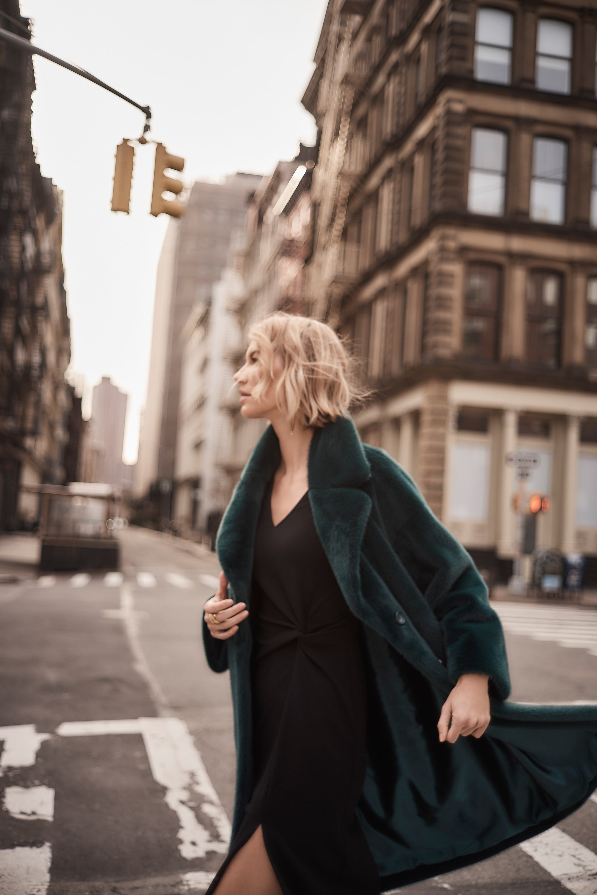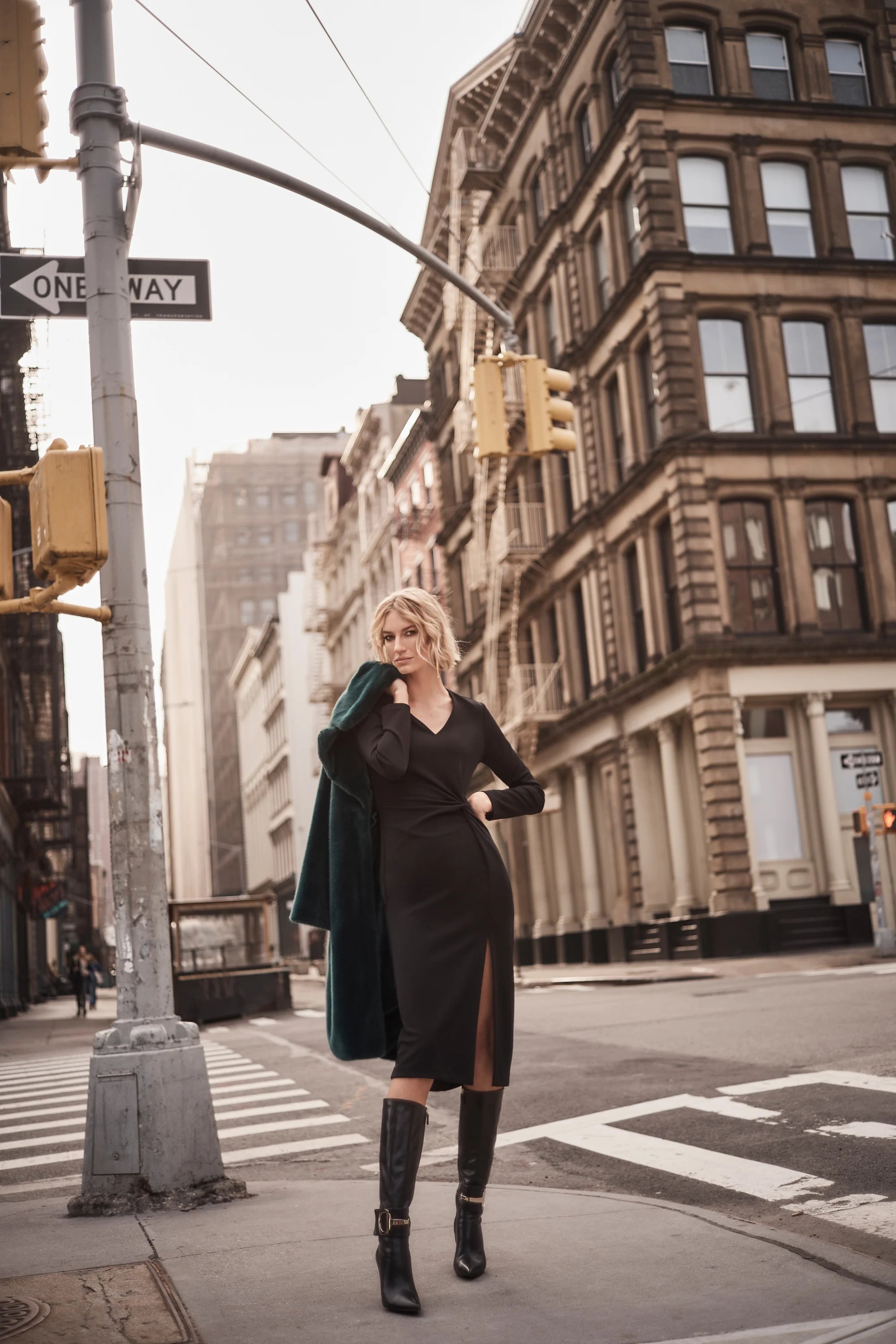 Capture the essence of contemporary elegance in this scuba crepe dress. The long sleeves pair beautifully with the V-shaped neckline to create a timeless allure. A front slit detail complements the garment’s chic sheath silhouette falling gracefully below the knee. The delicate back zipper closure adds a hint more sophistication to this stunning design.