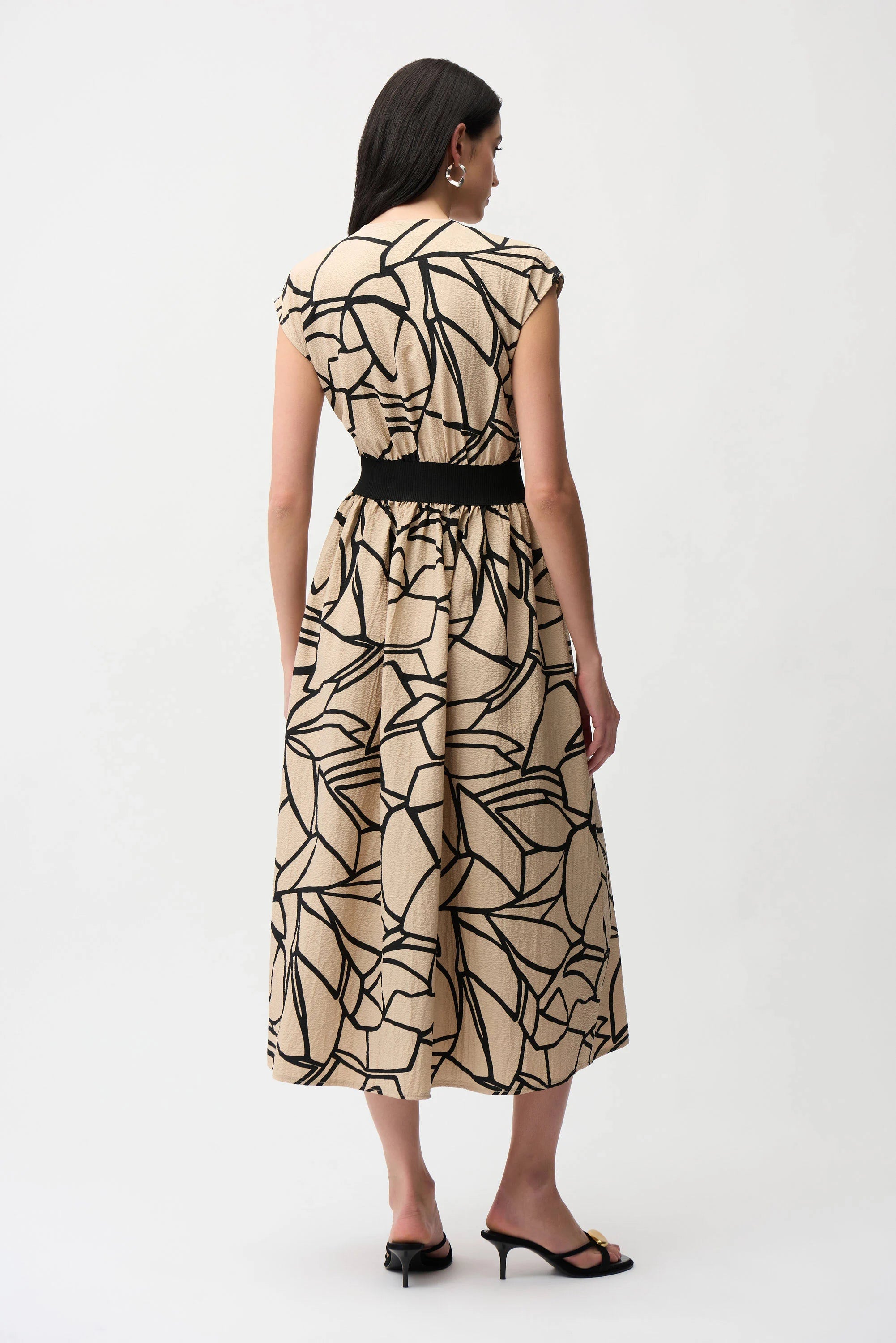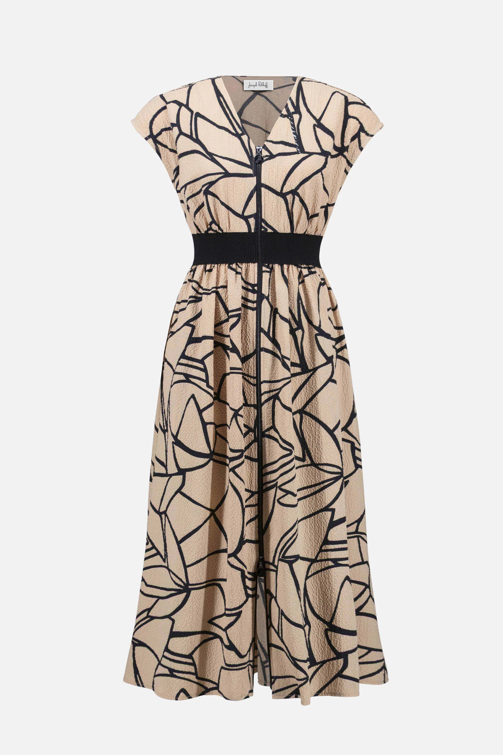 Striking and sculpted, this abstract-printed seersucker dress features a sleek front zipper, a ribbed black waistband for contrast, and cap sleeves that keep the silhouette crisp yet refined.