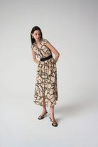 Seersucker Abstract Print Fit and Flare Dress- Beige/Black