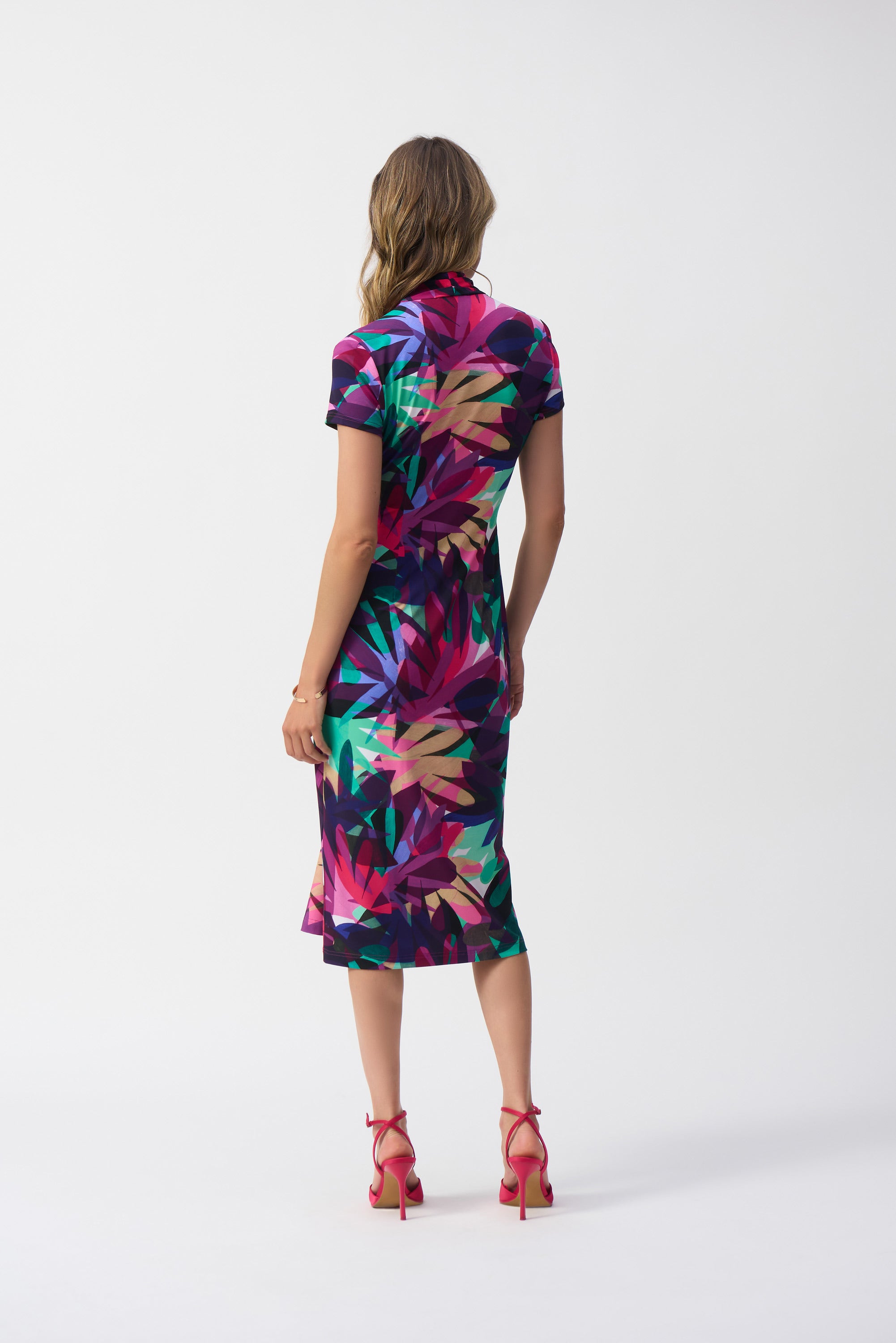Indulge in the utmost glamour while wearing this silky knit dress. Exquisitely adorned with a vibrant tropical print, the garment was tailored to be a unique standout. The wrap neckline and short cap sleeves infuse charm into the design while the waist draping with metal ornament complements the piece’s classic sheath silhouette.
