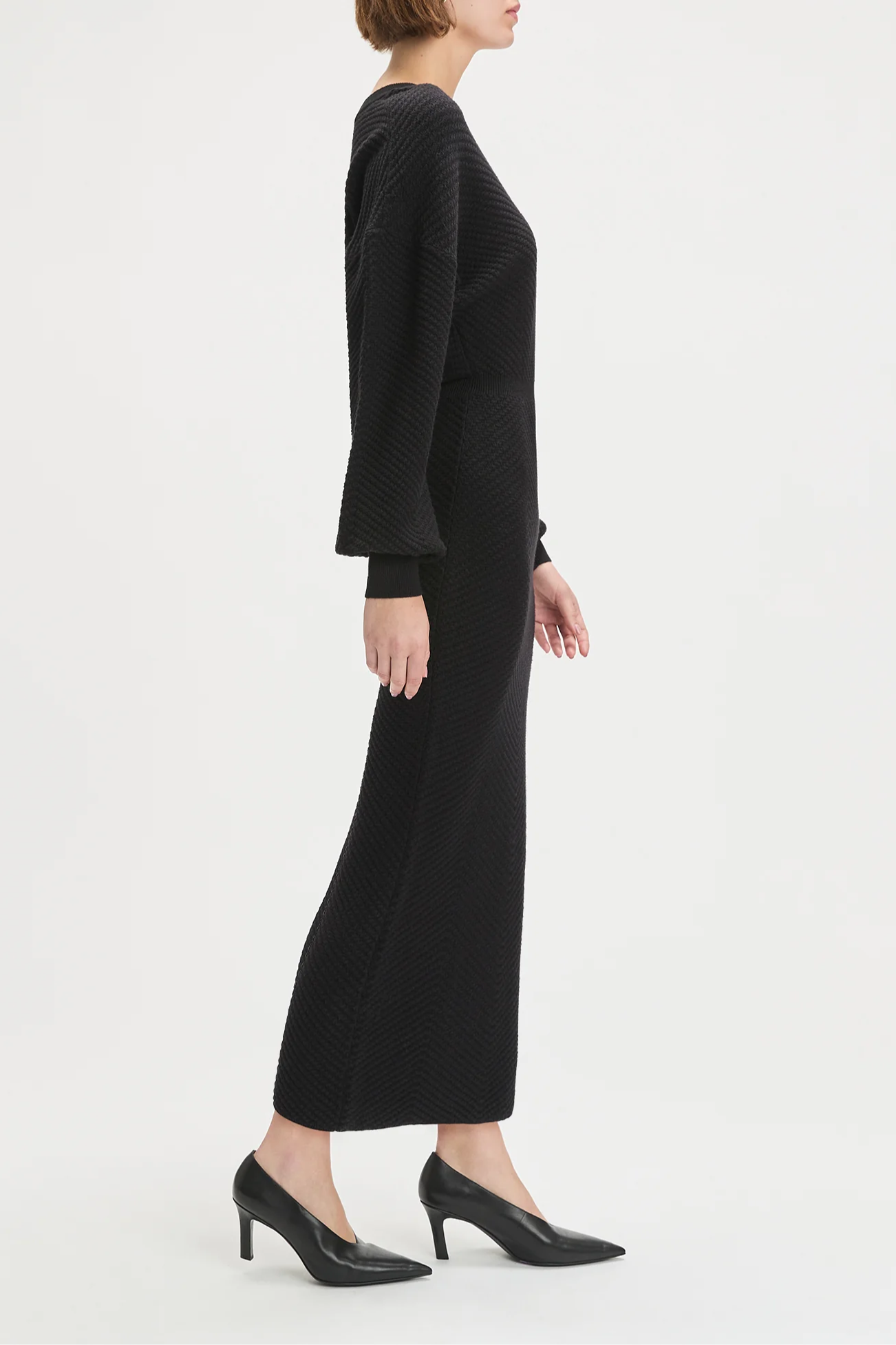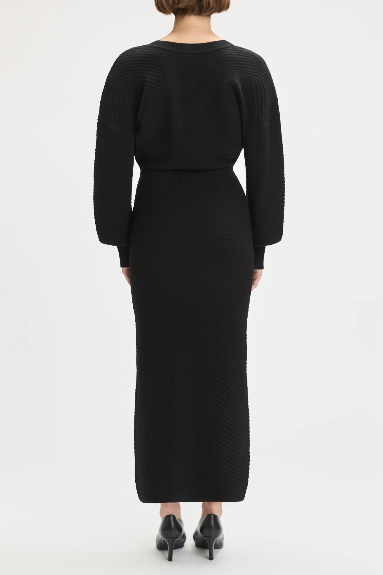 Comfort got dressed up. In soft chevron knit with a flattering V-neckline, blouson waist, and subtle sleeve drama, The Ava Dress hugs from the hips down in a 50" midi length.