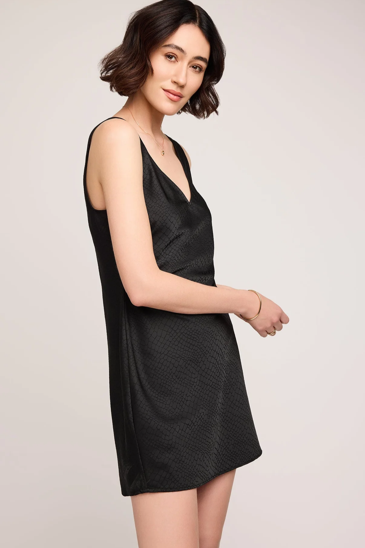The Winona dress is made of a bias cut satin jacquard fabric for a flattering fit. The classic slip dress silhouette features a front and back v-neckline.