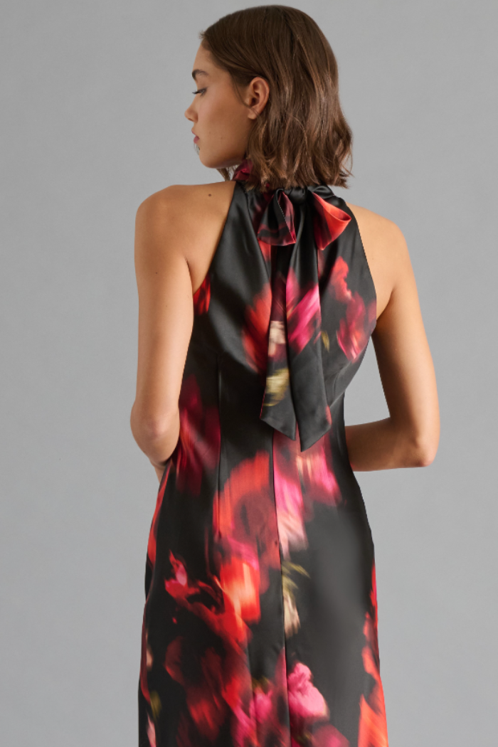 Sleeveless halter maxi dress with a fitted silhouette and ankle-length hem. Black base with blurred pink and red floral print. High halter neckline and narrow straps, shown with strappy sandals.