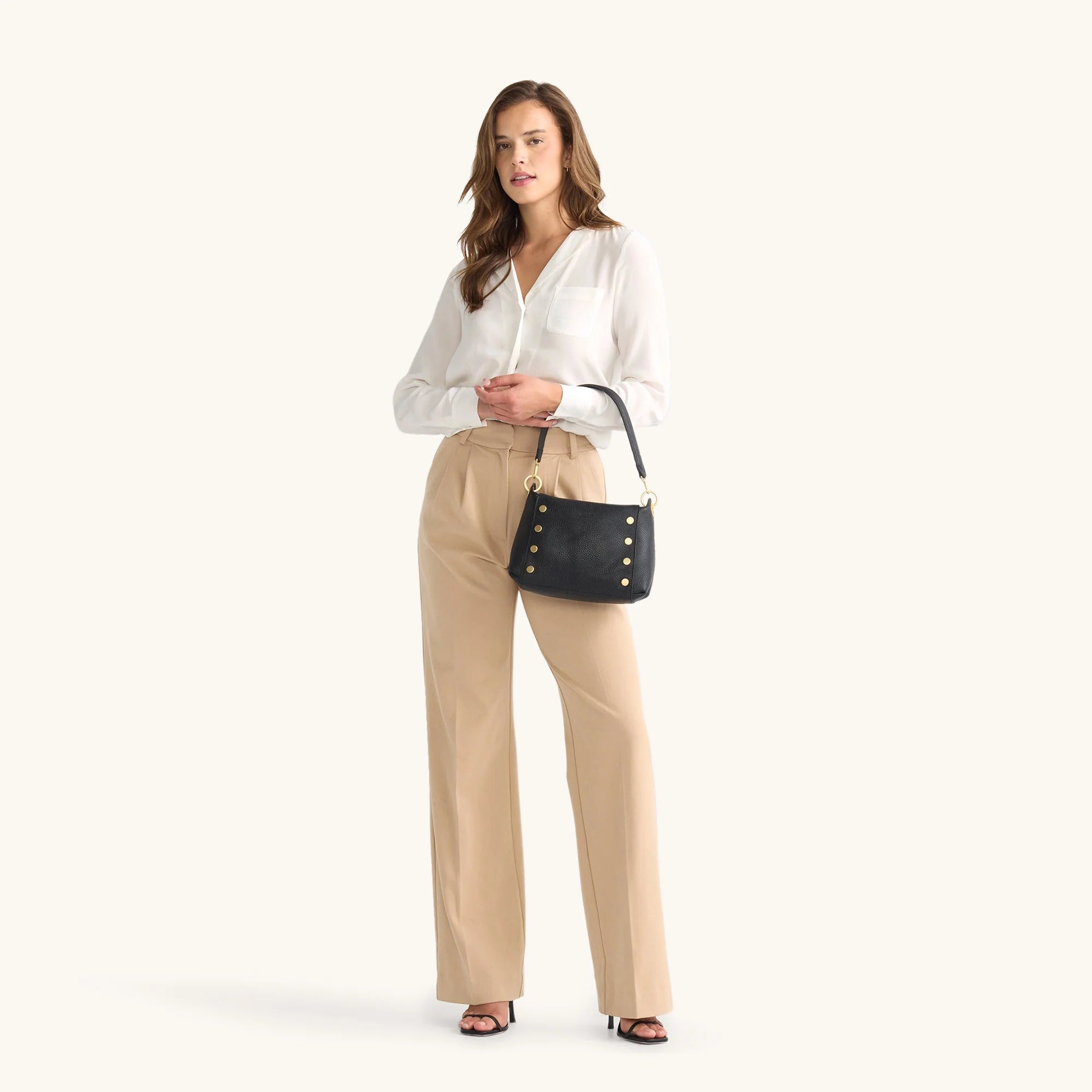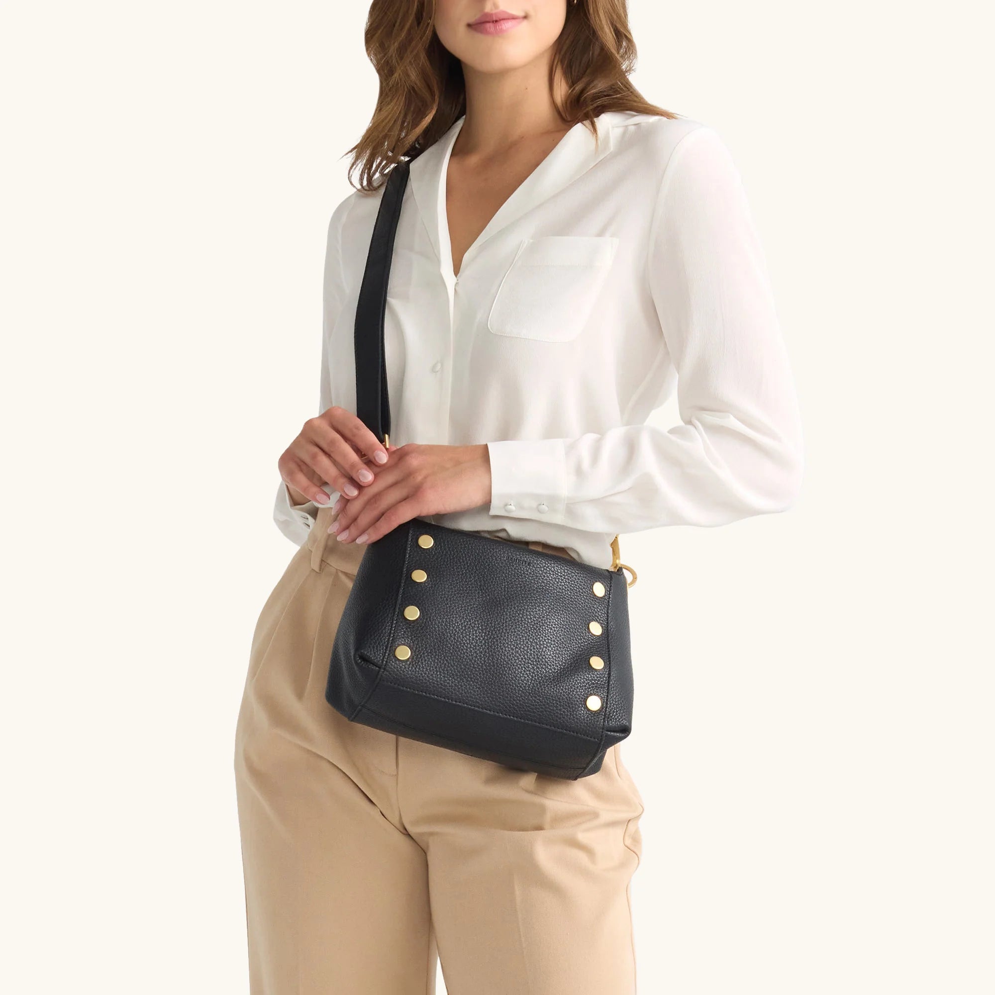- Brushed gold hardware