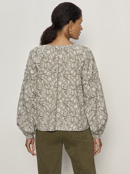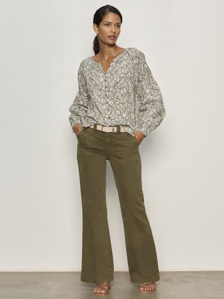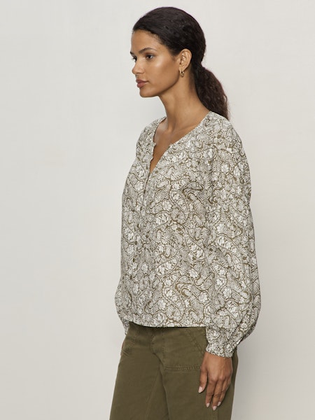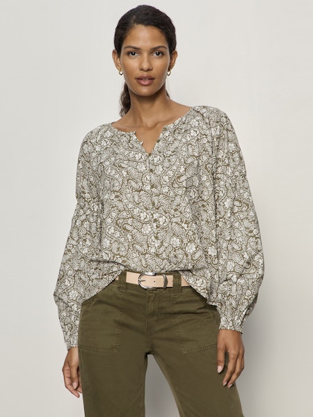 Easy, effortless, and endlessly wearable — this peasant-style blouse from Sanctuary brings soft structure to everyday dressing. Designed in a lightweight lyocell fabric, it features a button-front neckline and relaxed silhouette that drapes beautifully without feeling boxy. The long, full sleeves are finished with subtle gathering at the upper arm and elasticized cuffs for a feminine, lived-in feel. The Olive Branch print adds just the right amount of earthy texture, making it a perfect go-to from workdays to weekends.