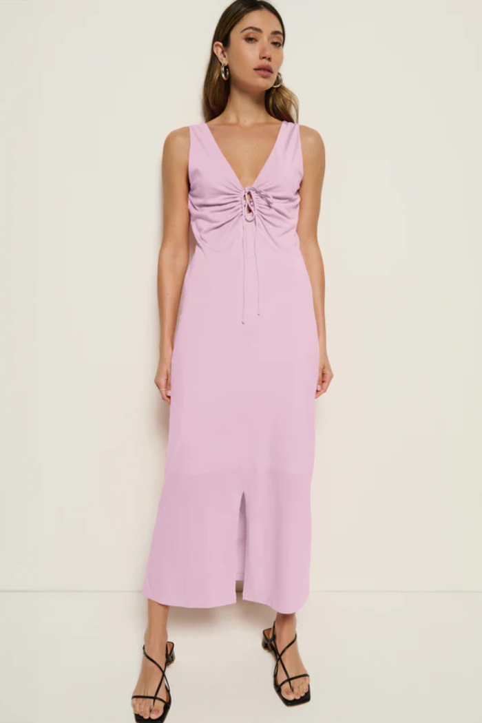 An ode to femininity -- the Gracie Dress has a is relaxed, yet polished look. Made in easy luxe jersey fabric, this form-fitting tank midi features a v-neckline with adjustable tie closure, front keyhole detailing, and lining for utmost comfort and coverage. This one comes in Lavender.