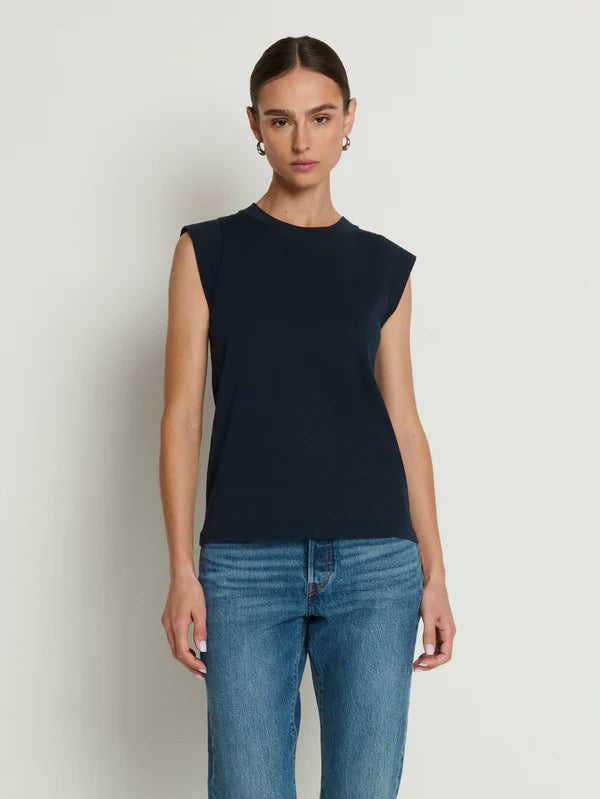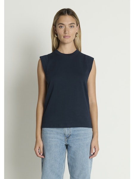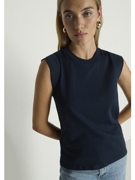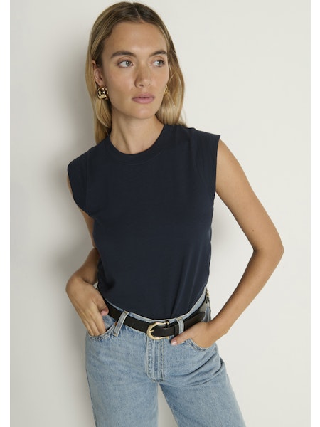 A muscle tank, but make it feminine, with a ribbed, crew neckline and over the shoulder short sleeves.