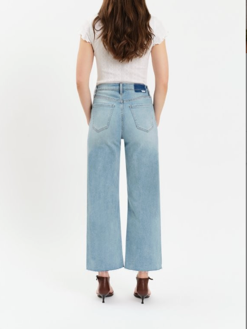 The Pleaser in New Light is our tried and true high rise wide ankle in a dark blue indigo with soft fading. Constructed from our Hug fabric, this jean is flexible enough to hug your body, yet heavy enough to cinch you in.