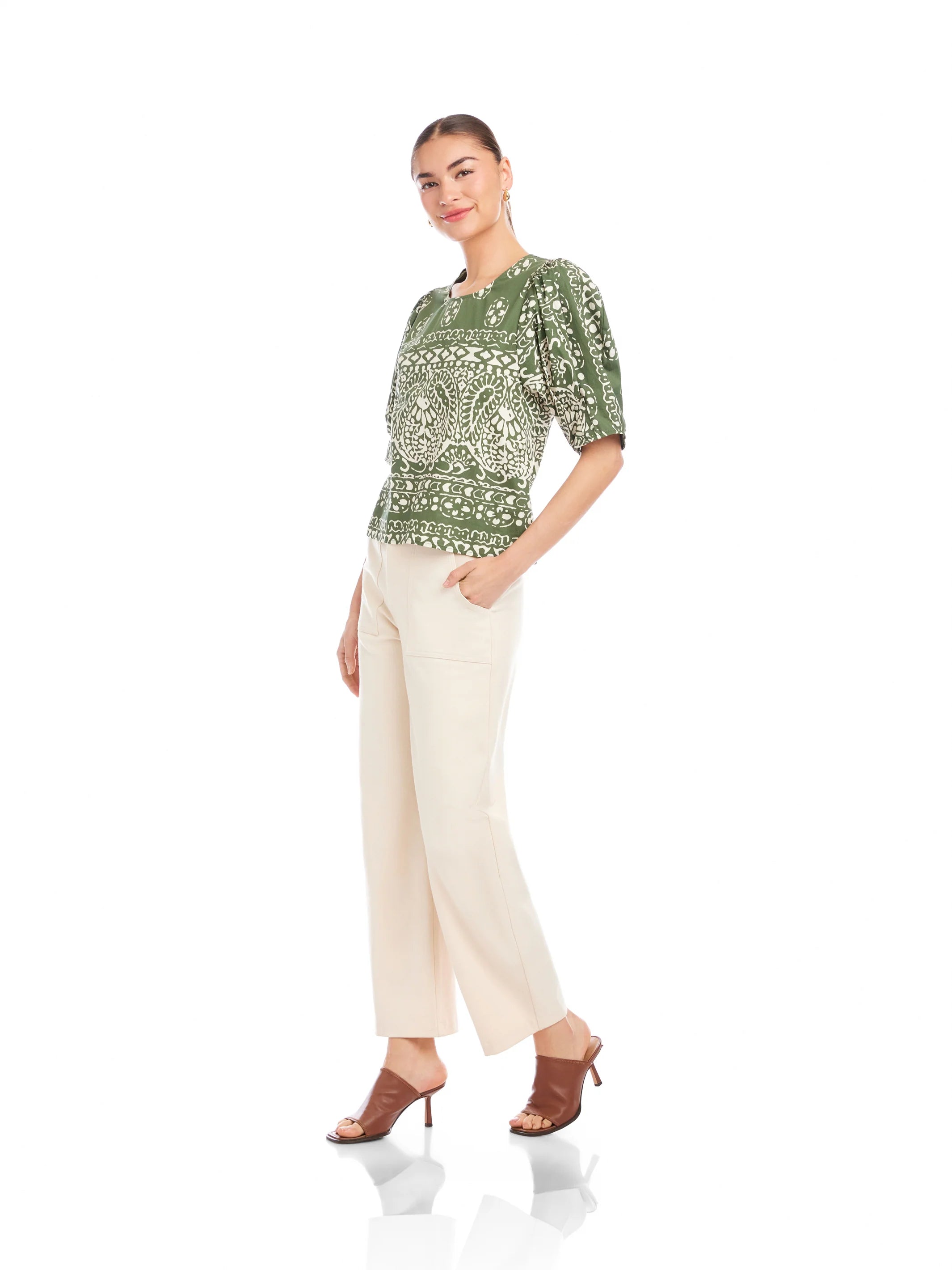 This top features an intricate stamped scarf-inspired cotton print with a soft scoop neckline. Puff sleeves with gathered shoulders add volume and shape, while a back keyhole closure offers an easy finish. A unique, textural statement piece with a lightweight feel.