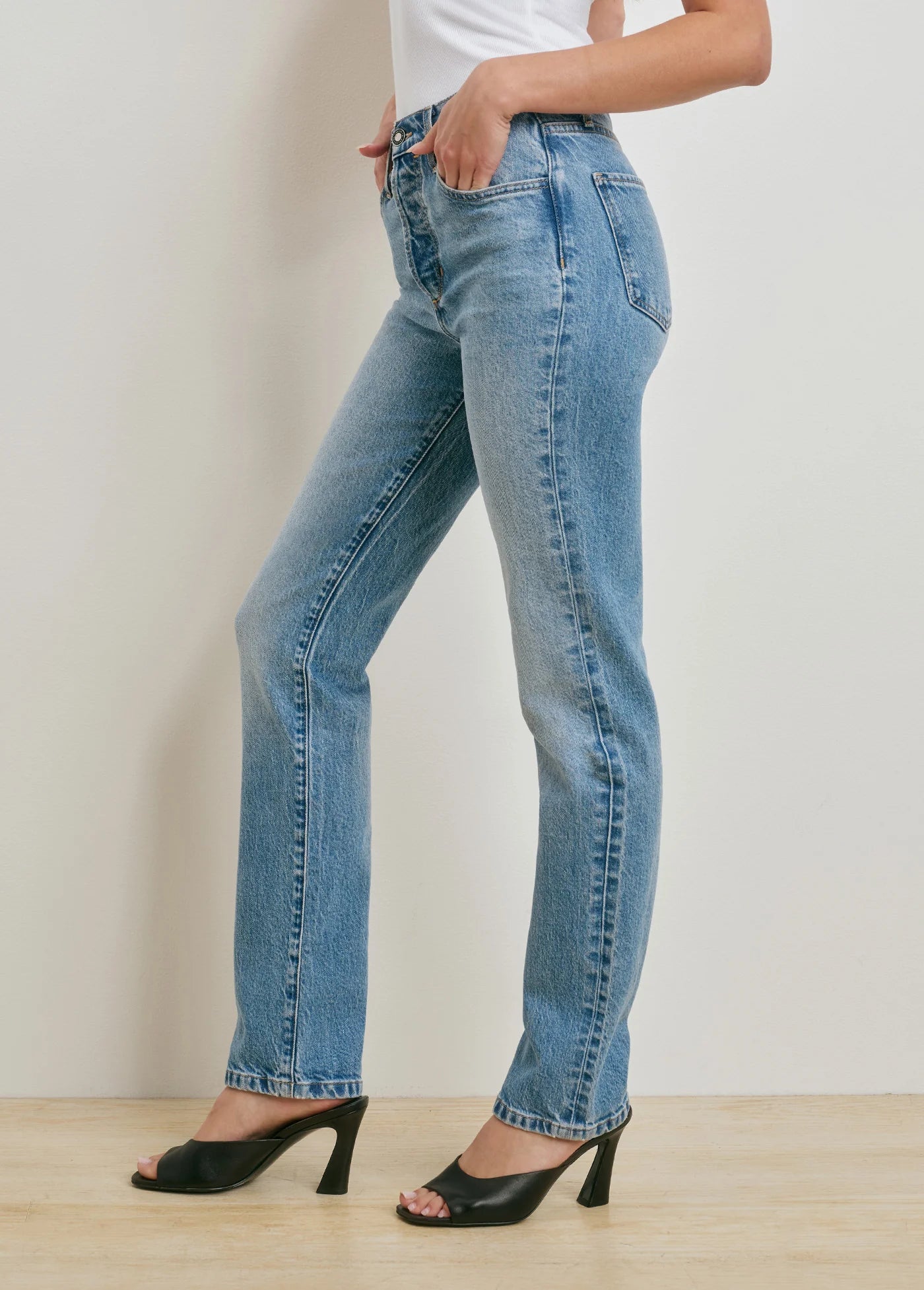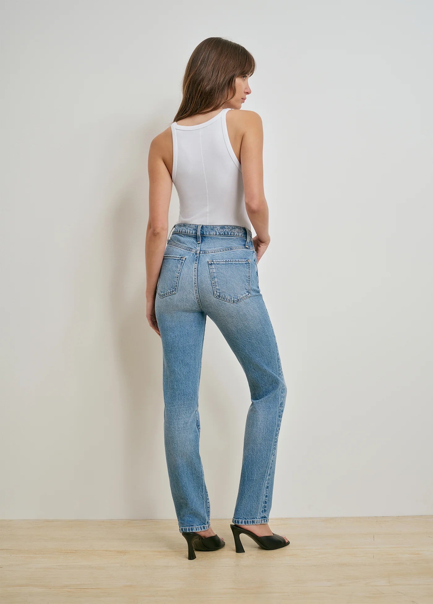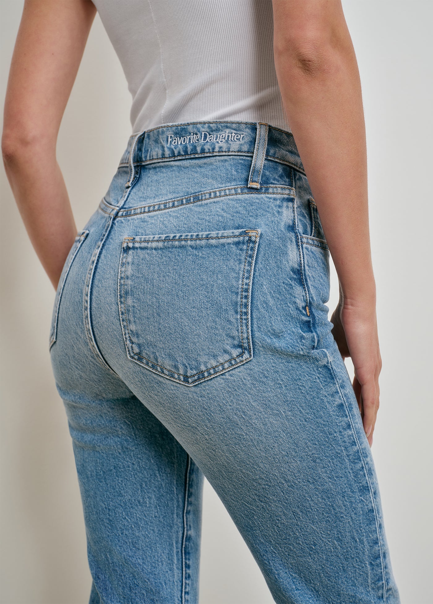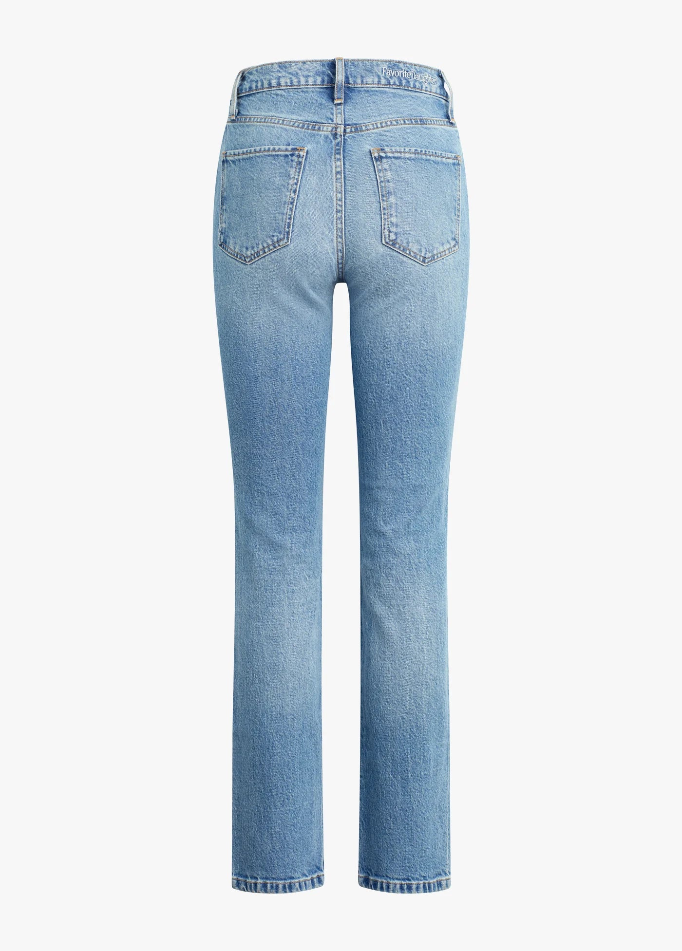 A new mid-rise, slim-straight jean that's fitted at the hip with a two-piece wrap waistband that hits slightly lower at front and higher at the sides and back.