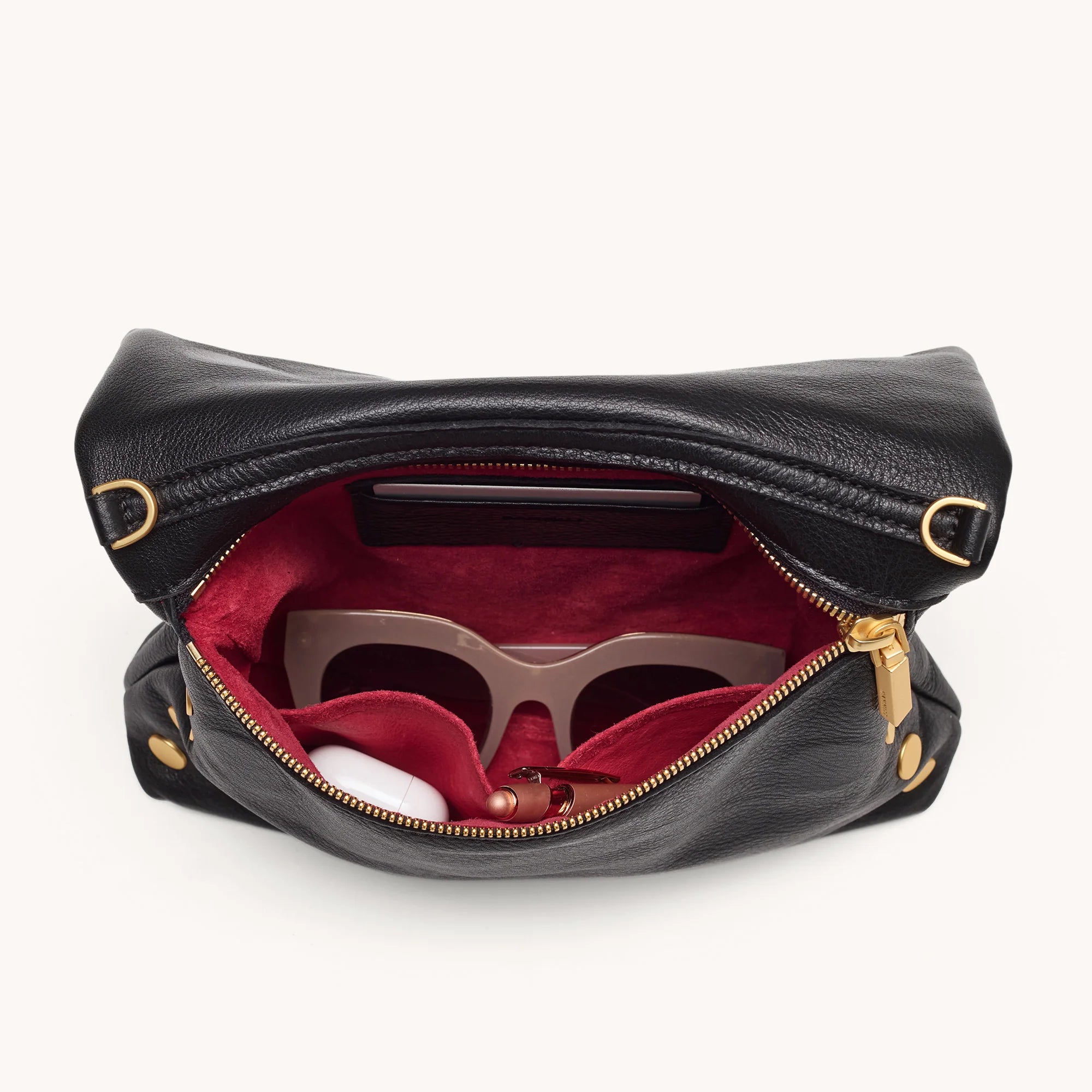 Because you're a VIP. Our all-time best-seller, this VIP in buttery black leather features an optional strap and elevated brushed gold rivets. Plus, you'll find a subtle strip of red peeking out along the bag's back seam. We're classy like that.
